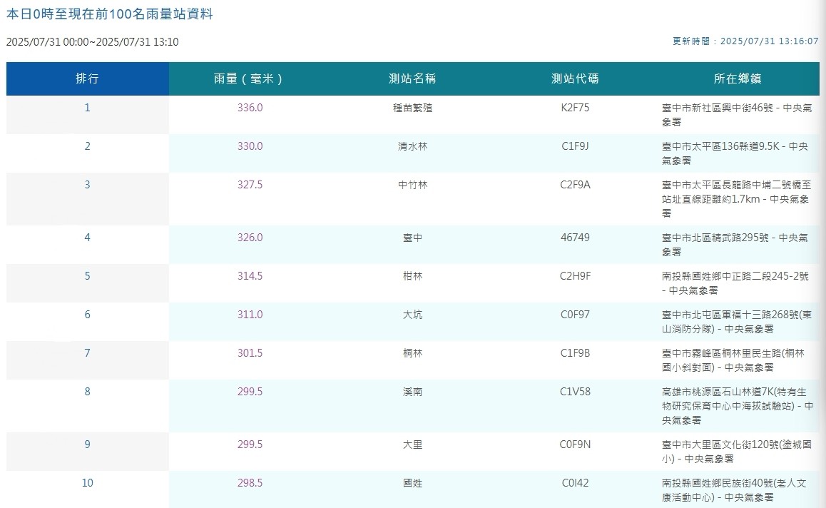 受低壓帶及西南風影響,台中市今(31)日自凌晨起持續降下大雨。據中央氣象署統計,截至今午,全台累積雨量前10名雨量站資料中,台中市即佔據7處,顯示為此次豪雨降雨最集中區域之一。其中以新社區種苗繁殖場測站累積達336毫米,為全台最高,其次為太平區清水林測站330毫米,太平區中竹林測站327.5毫米,北區台中測站326毫米,北屯區大坑測站311毫米,霧峰區桐林測站301.5毫米,大里區大里測站則299.5毫米。市府已即時調度防汛資源,全力降低積淹水風險。