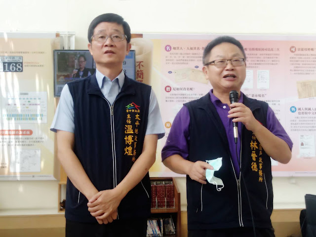 地政局主任秘書溫博煌(左),人如其名,地政登記業務可說旁徵”博”引,口出釋字或增修條文是桌上拿柑,與同事切磋法令,能讓同事思緒突感燈火輝”煌”,且與他共事的人都說他談吐”溫”文儒雅,猶如一盞輝”煌”明燈指引迷途小書僮。多年好友地政士陳昭舒說,溫博煌從中正地所初審到太平地所主任、專委、主秘,協助過上百餘位地政士解釋法令意涵。