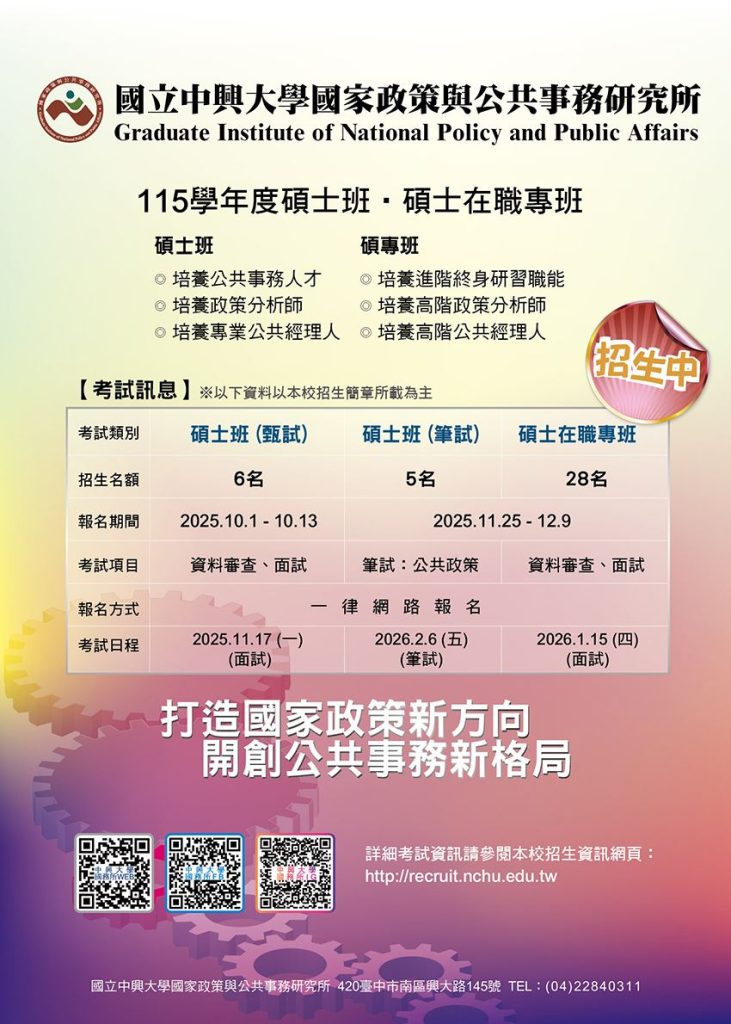 中部最拔尖的公共政策在職專班,莫屬國立中興大學,最近開始計畫招生限額30名,時間至12月9日止。