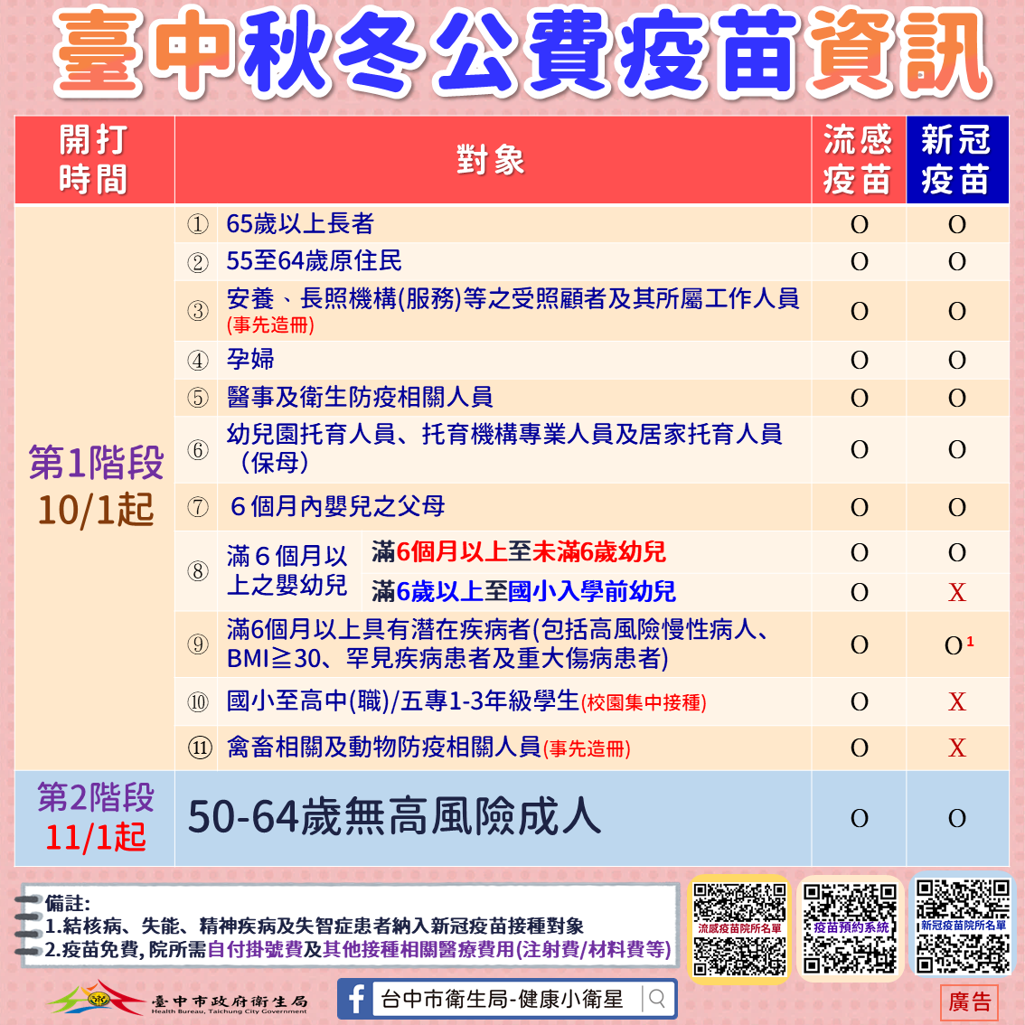 第一階段公費流感疫苗對象為醫事及衛生防疫相關人員、65歲以上長者、55歲以上原住民、滿6個月以上至國小入學前幼兒、孕婦及6個月內嬰兒之父母等11類,公費新冠疫苗對象為醫事及衛生防疫相關人員、65歲以上長者、55歲以上原住民、滿6個月以上至未滿6歲幼兒等9類;第二階段於11月1日起開放公費流感及新冠疫苗50至64歲健康成人接種。