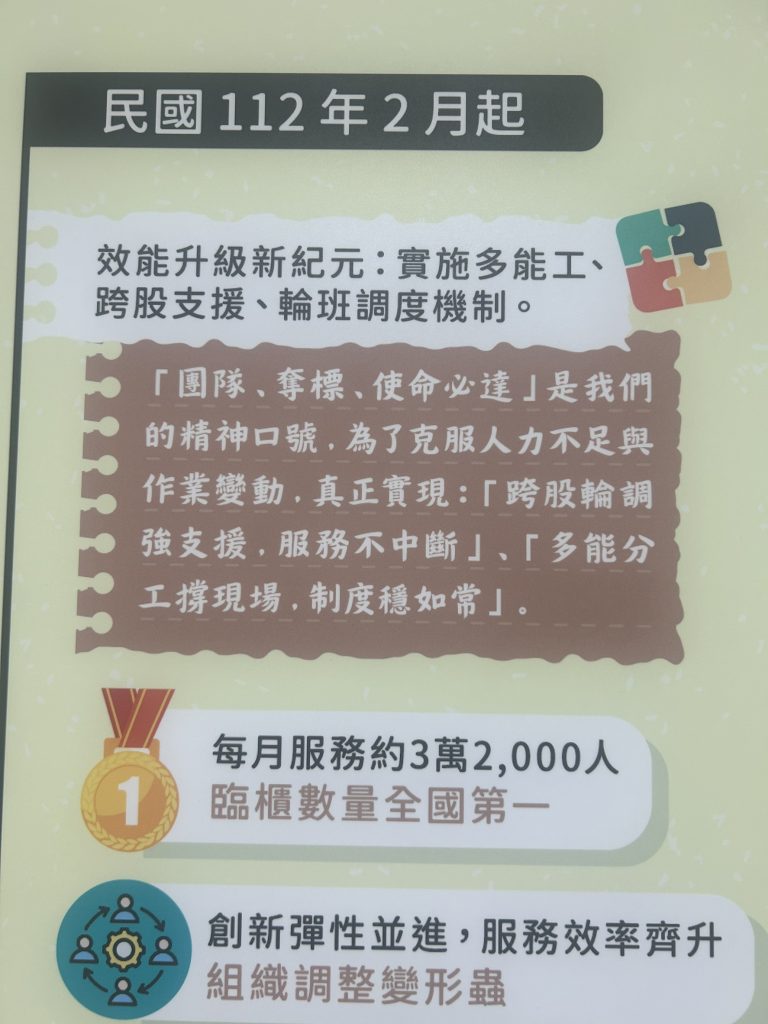 臺中市監理站新大樓採原地重建、服務不中斷之施工方式,持續提供民眾便捷服務。培養具備多技能及多工能力的專業人才,實施跨股支援與業務集中化等措施,優化洽公動線並有效縮短民眾辦理時間,提升整體服務效能。Google評論數共7,000多則,得到4.5顆星的全國監理所站極高評價。