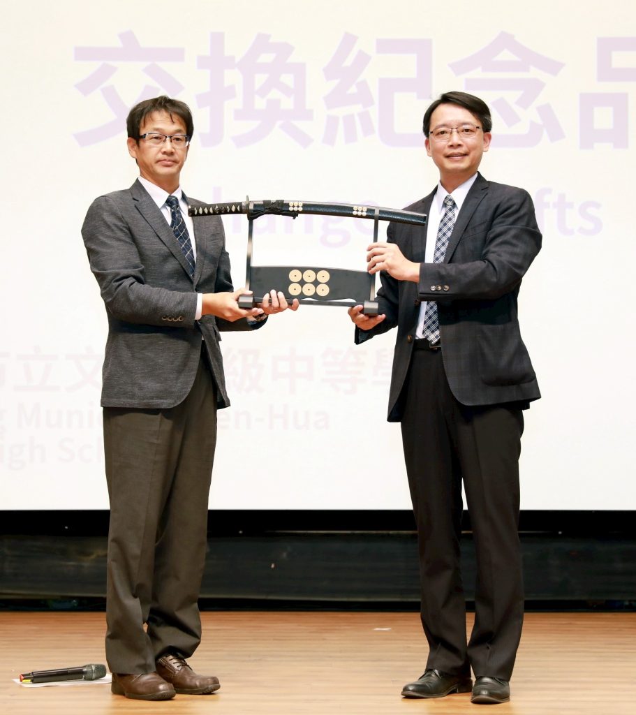 上田西高校代表(左)致贈武士刀給文華高中,武士刀代表了武士所遵循的倫理和道德,如「義、勇、仁、禮、誠、名譽、忠義」等價值觀。文華高中校長黃偉立(右)大方接下這份貴重的禮物。