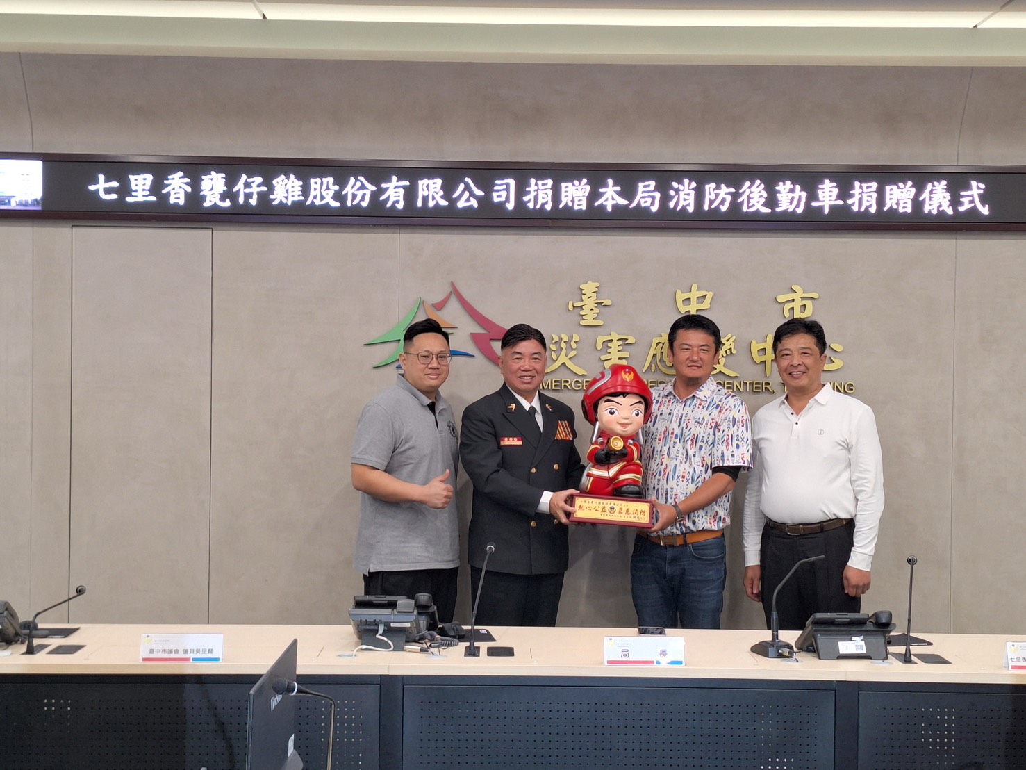 強化第一線救災指揮能量,公私協力再添典範。七里香甕仔雞股份有限公司在台中市議員吳呈賢、吳建德牽線促成下,今(11)日捐贈一部高性能消防指揮車給台中市政府消防局,協助提升重大災害現場的即時指揮與整合調度效能。消防局特別於主管會報中舉辦贈車儀式,由消防局長孫福佑主持,各級主管幹部出席觀禮,對企業善行與民代促成表達高度肯定與感謝。