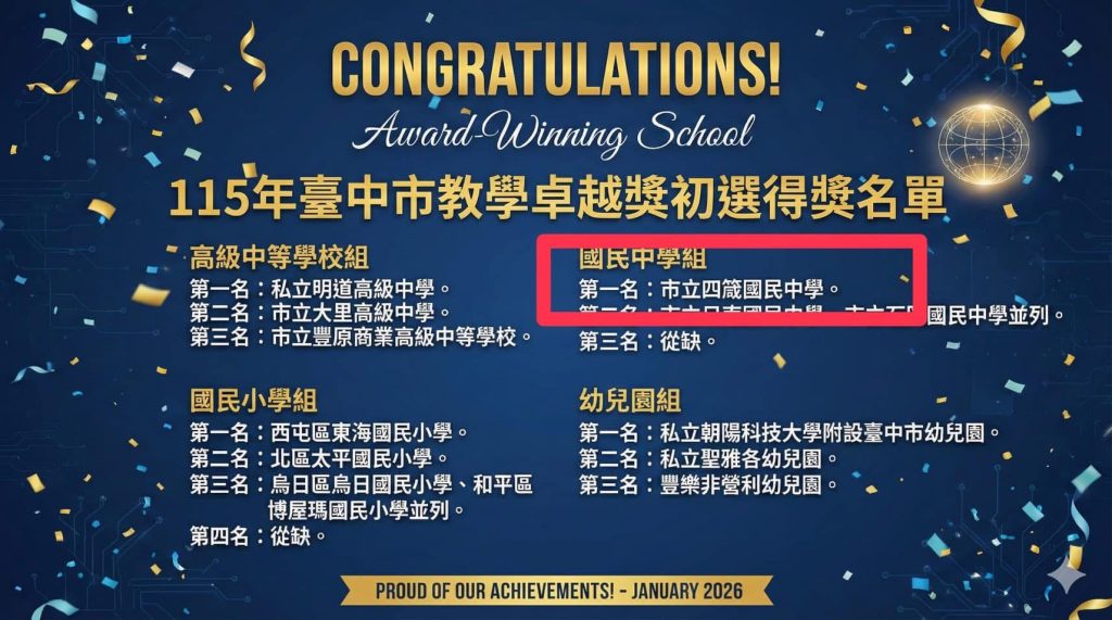 四箴國中此次榮獲臺中市教學卓越初賽第一名,關鍵在於我們選擇了一條「不追逐排名,而是深耕孩子生命」的教育道路。學校位處大肚臺地,學生背景多元,面對隔代教養、經濟弱勢與學習差異交織的現實,我們深知,唯有讓孩子被真正看見,學習才會發生。