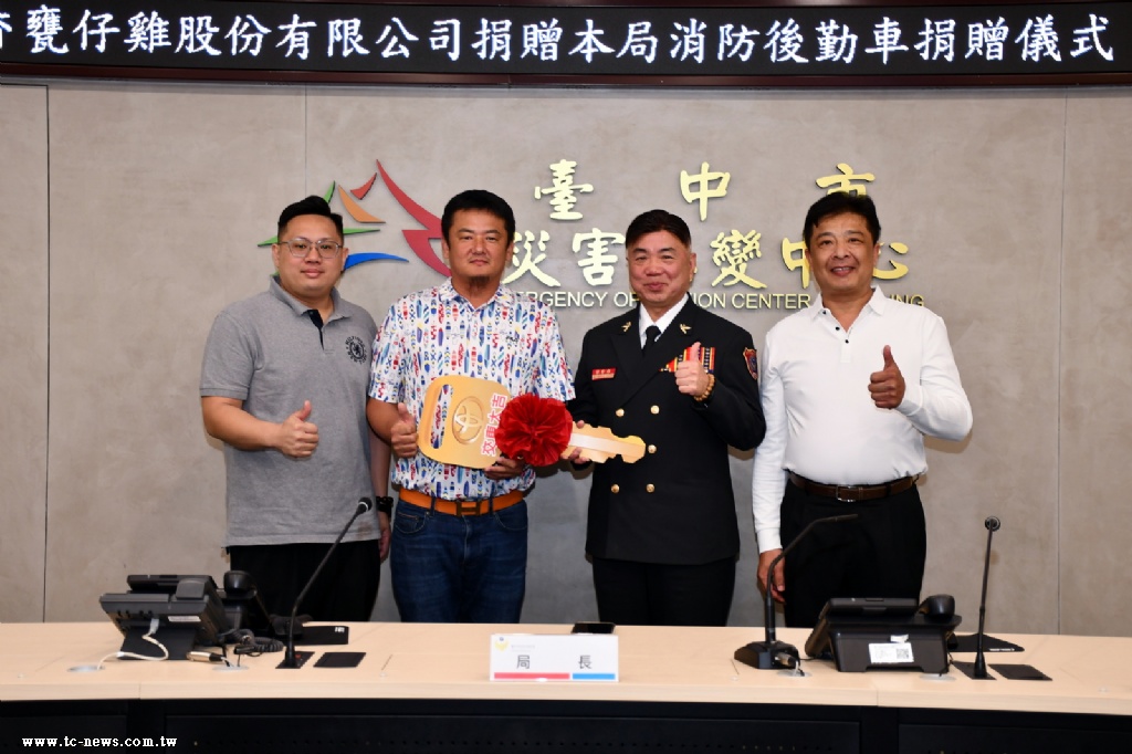公私協力防災,七里香甕仔雞公司在台中市議員吳呈賢、吳建德牽線促成下,捐贈一輛高性能消防指揮車給台中市政府消防局,協助提升重大災害現場的即時指揮與整合調度效能。消防局今天在主管會報中舉辦贈車儀式,消防局長孫福佑主持,感謝企業善行與民代促成。