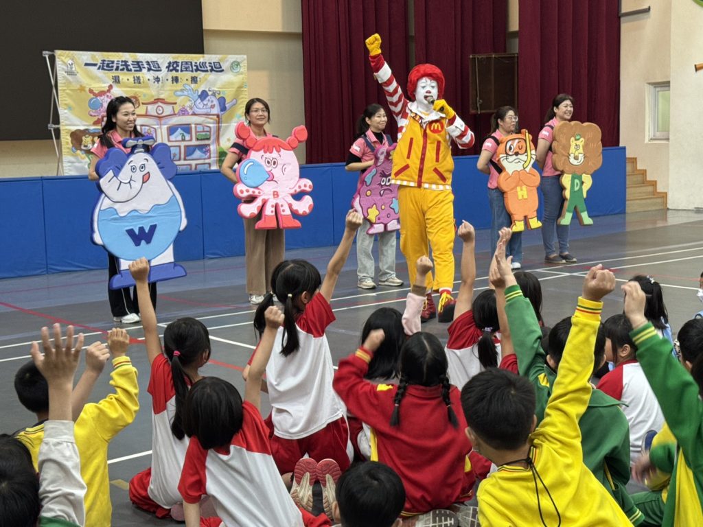 新平國小特別邀請超人氣防疫大使「麥當勞叔叔」蒞臨校園,為幼兒園及國小低年級學童帶來一場別開生面的「洗趣腸病毒,健康樂無憂」防疫宣導活動。現場歡笑聲不斷,孩子們在音樂與互動劇中,輕鬆將正確洗手觀念深植腦海。