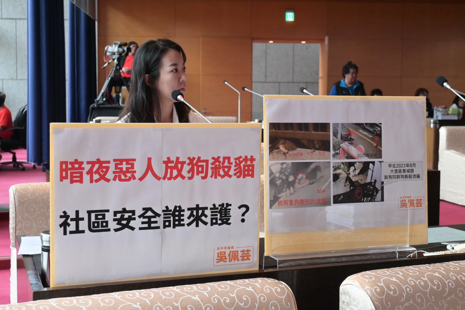 吳佩芸於議會播放民眾蒐集的監視器影像指出,相關事件並非偶發。畫面顯示,3月24日及3月28日凌晨,南區忠孝路接連發生街貓遭犬隻攻擊死亡事件;此外,大里區喬城路亦曾於2025年10月及2023年8月發生類似案件,2023年甚至造成街貓死亡,情節令人震驚。